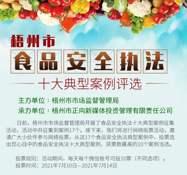 本次所参与投票的案例,是由365体育官网市市场监督管理局从365体育官网市场监管系统自2020年1月以来办结的食品安全执法案例中,仔细筛选出的17个典型案例,案例涉及假冒食品、添加非食用原料食品、超限量使用食品添加剂食品、经营未经检验检疫的进口食品等方面。这些案例具有典型意义,影响较大,在消费者中引起强烈反响、引起社会广泛关注。