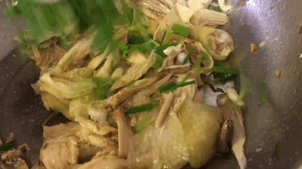 斩鸡,撕鸡,放调味料搅拌,整个过程一气呵成。看着眼前搅拌好的成品手撕鸡,一股混杂着鸡肉、麻油、香菜、香葱、蒜头的香味飘进鼻孔,腹中空空如也的食侠,感受到胃里馋虫狂动,口水差点流下来。